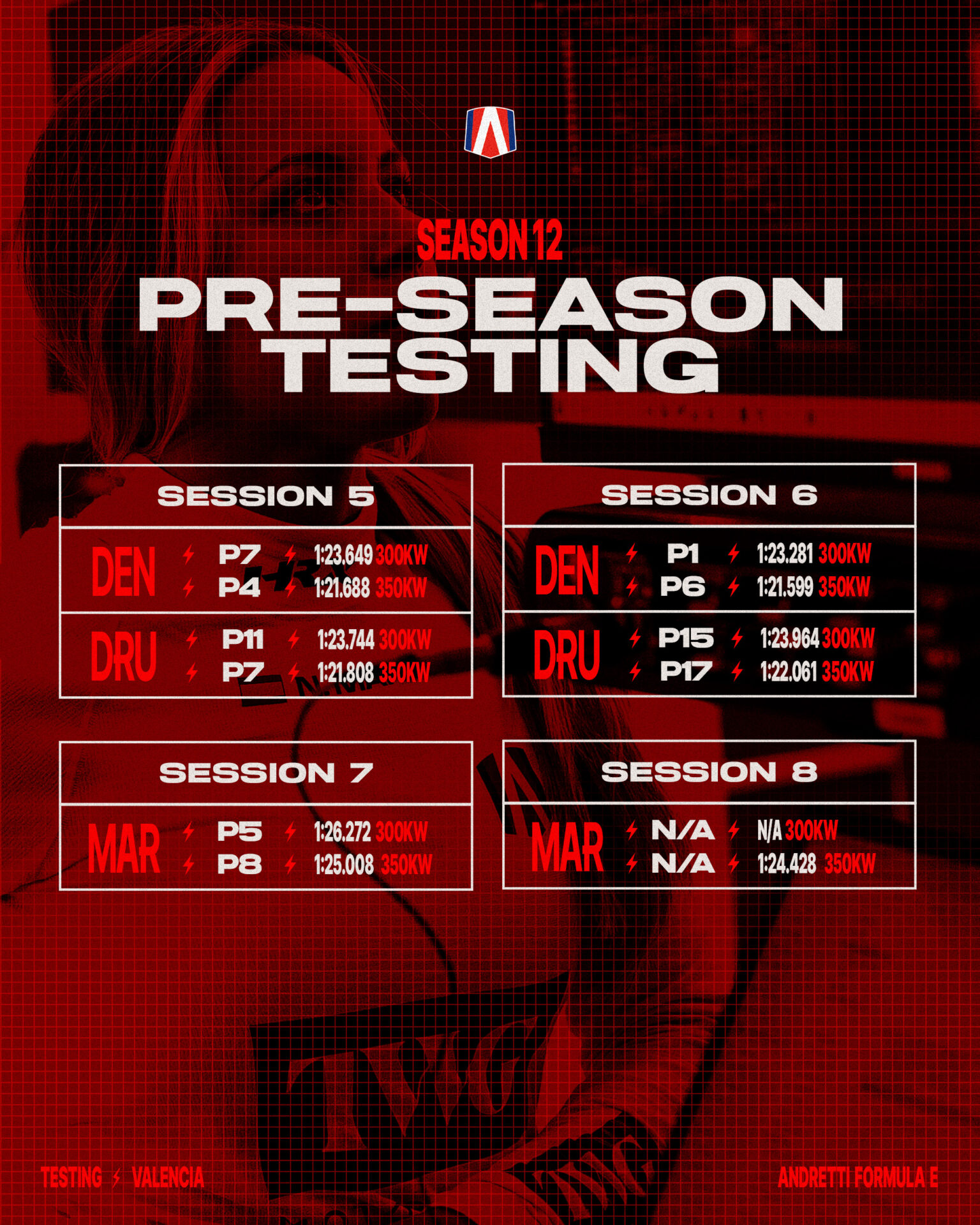 Andretti’s test program maximized every minute on track, covering off-season software updates, energy management runs, tire evaluations and simulations of practice, qualifying and race conditions. Dennis was consistently among the quickest, delivering multiple top-three finishes in 300kW runs and setting the second-fastest overall 300kW lap of the week at 1 minute, 23.281 seconds in Session 6.