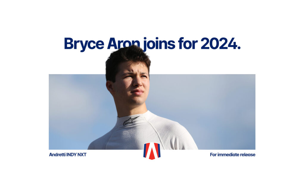 INDIANAPOLIS (October 11, 2023) – Andretti Global announced today that Bryce Aron will join the team’s 2024 INDY NXT by Firestone driver lineup piloting the No. 27 Andretti Dallara. The American rookie is the second confirmed Andretti INDY NXT driver for the 2024 season, joining already announced teammate James Roe.