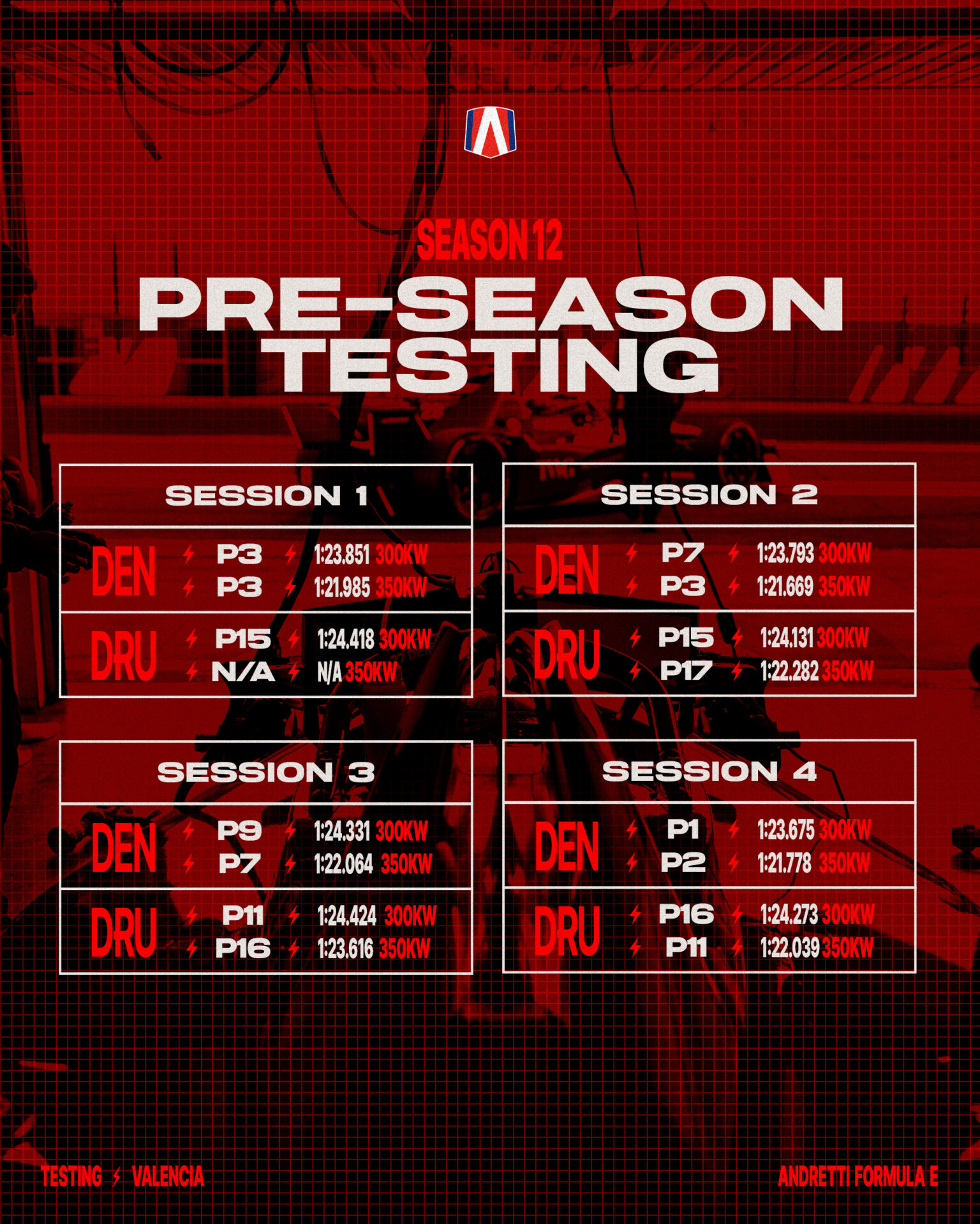Andretti’s test program maximized every minute on track, covering off-season software updates, energy management runs, tire evaluations and simulations of practice, qualifying and race conditions. Dennis was consistently among the quickest, delivering multiple top-three finishes in 300kW runs and setting the second-fastest overall 300kW lap of the week at 1 minute, 23.281 seconds in Session 6.